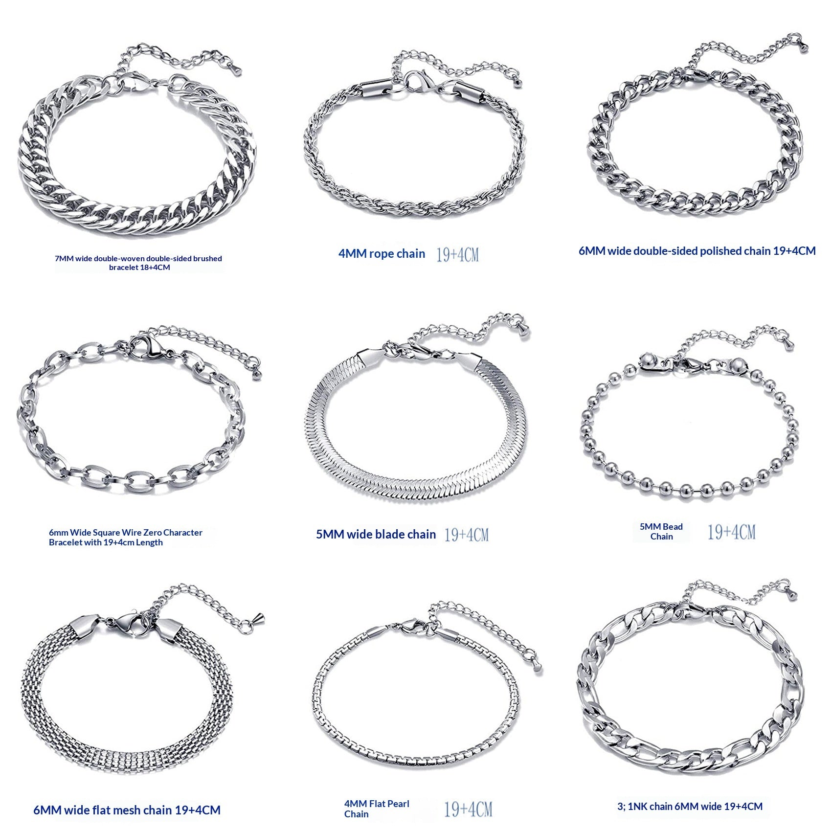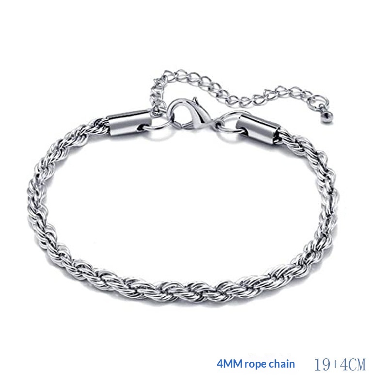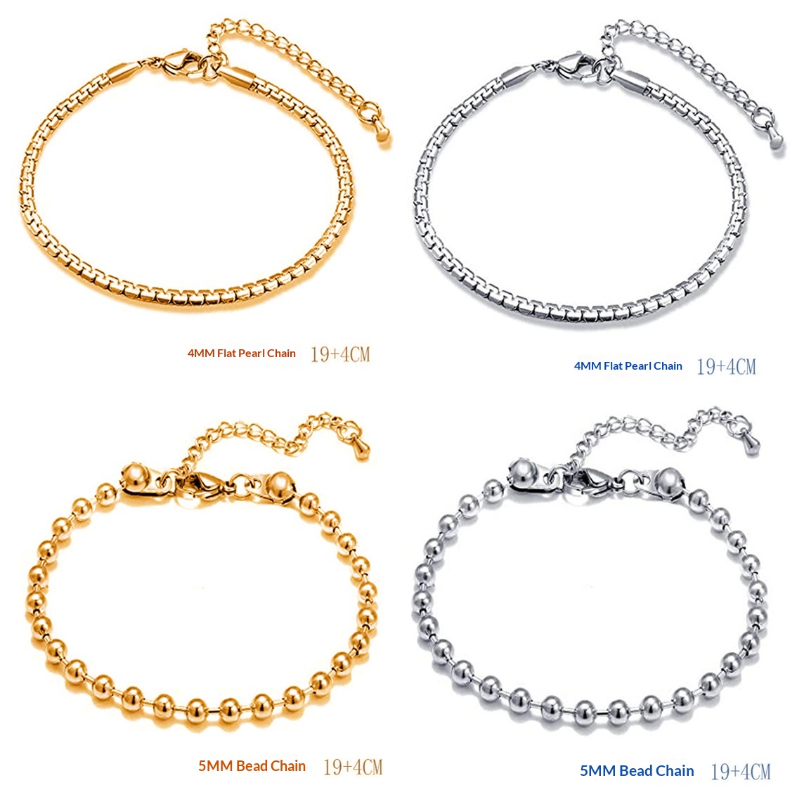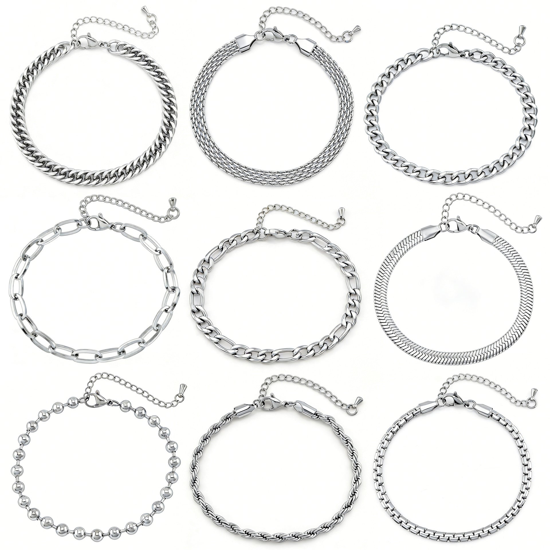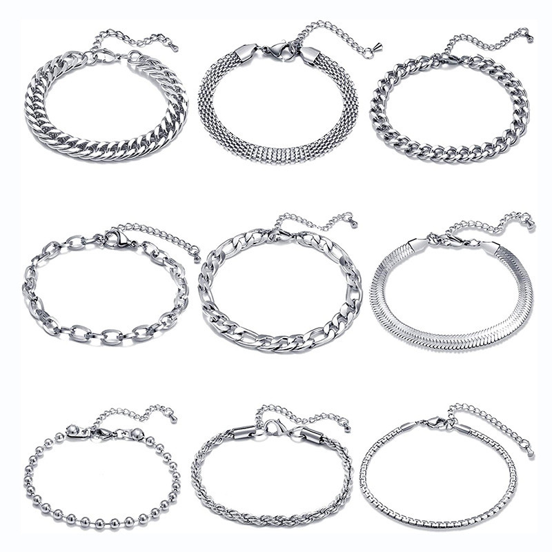 Purity: C626519-5 Double-Braided Double-Polished Bracelet, C424019-5 Twisted Chain Bracelet, C126619-5 Double-Polished Bracelet, C286019-5 Square-Wire O-Chain Bracelet, C255019-5 Beveled-Edge Bracelet, C345019-5 Wave-Bead Bracelet, C276019-5 Flat Mesh Chain Bracelet, C334019-5 Flat Pearl Bracelet, C416019-5 NK 3:1 Bracelet