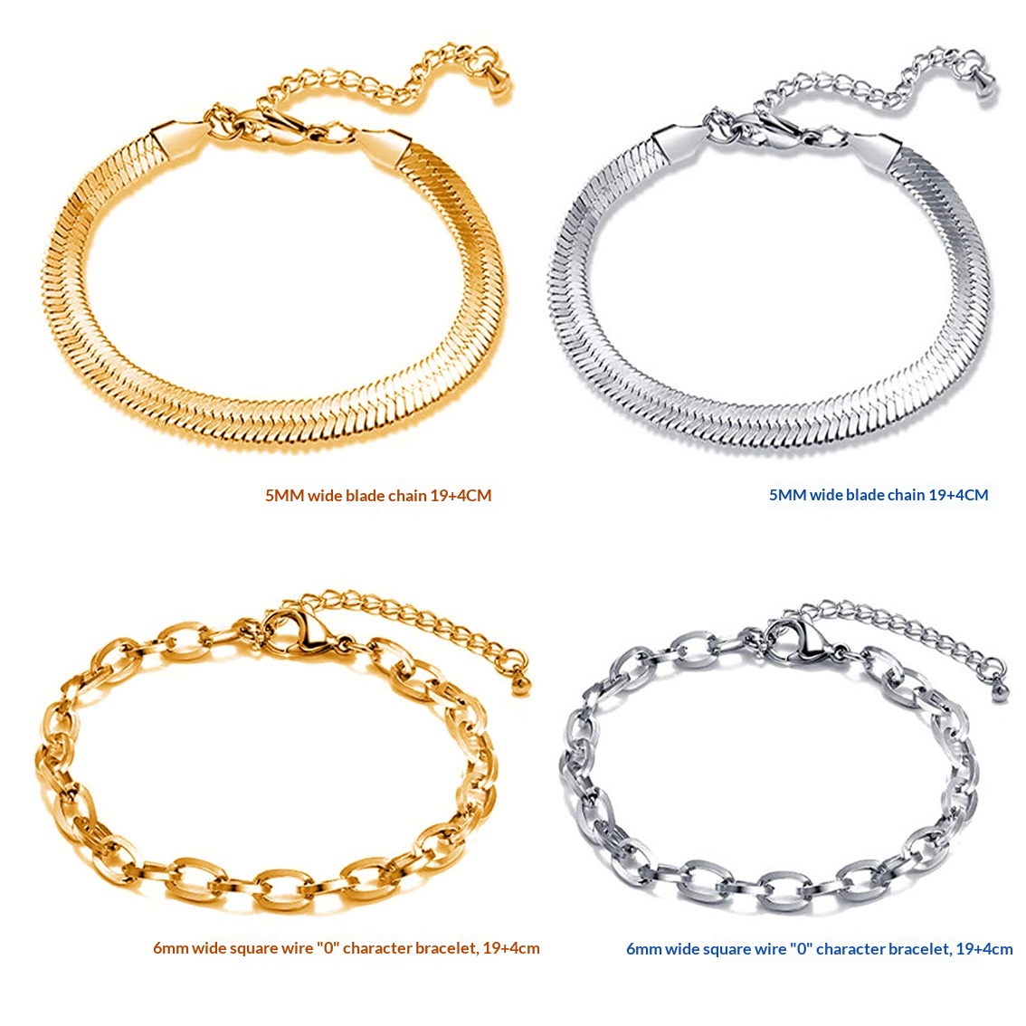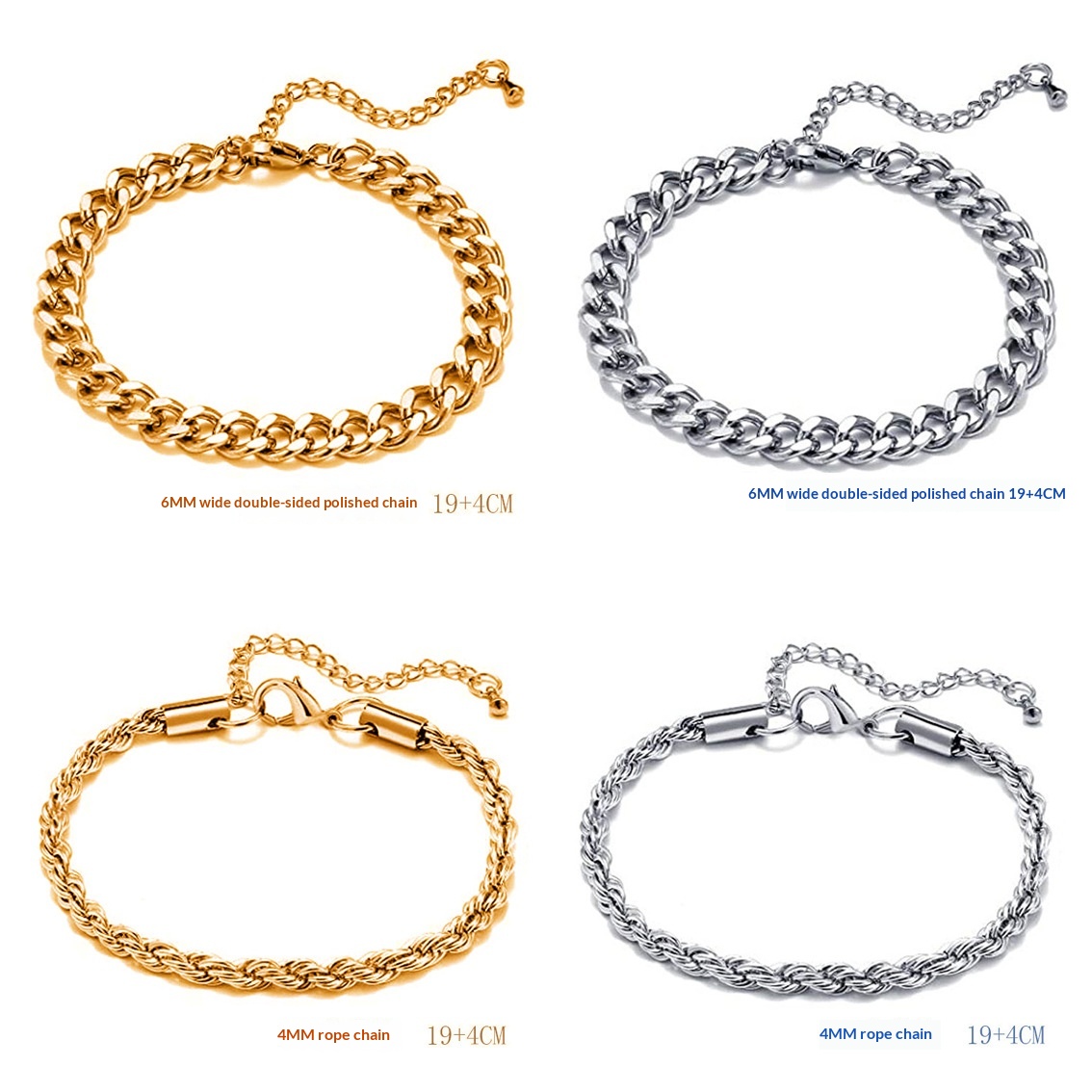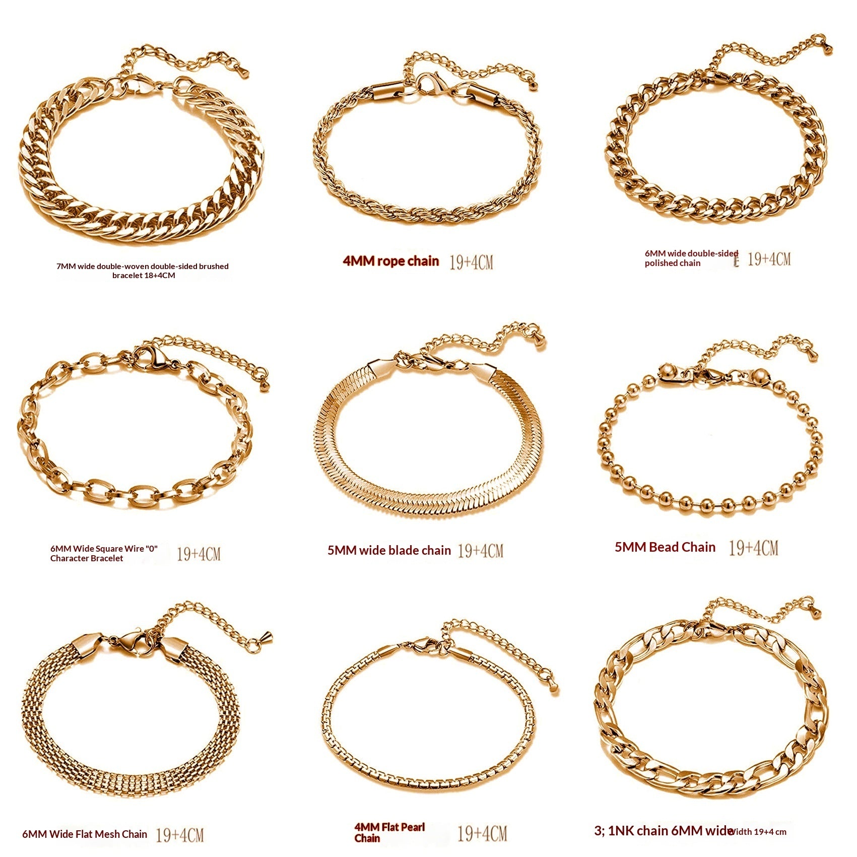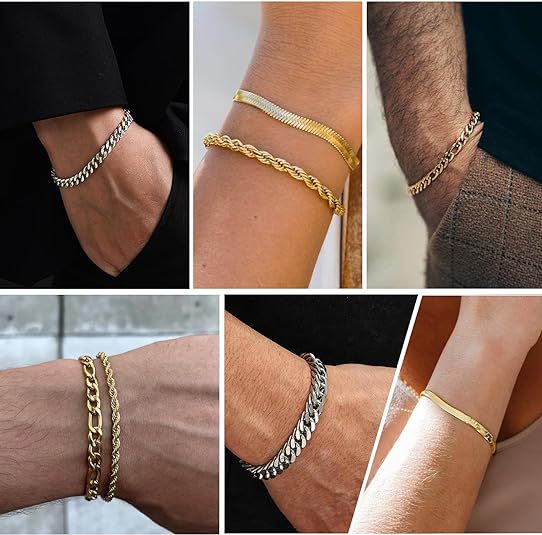 Purity: C626519-5 Double-Braided Double-Polished Bracelet, C424019-5 Twisted Chain Bracelet, C126619-5 Double-Polished Bracelet, C286019-5 Square-Wire O-Chain Bracelet, C255019-5 Beveled-Edge Bracelet, C345019-5 Wave-Bead Bracelet, C276019-5 Flat Mesh Chain Bracelet, C334019-5 Flat Pearl Bracelet, C416019-5 NK 3:1 Bracelet
